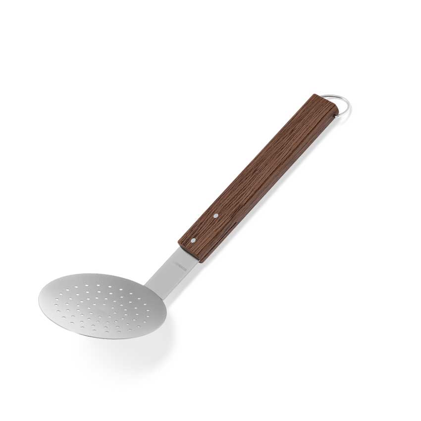 Solid paella/hullsleiv produsert av rustfritt stål. Med D-formet ergonomisk håndtak produsert av FSC-sertifisert røkt ask. Et slitesterkt, hardt og vakkert tre som varmebehandles for et langt liv.