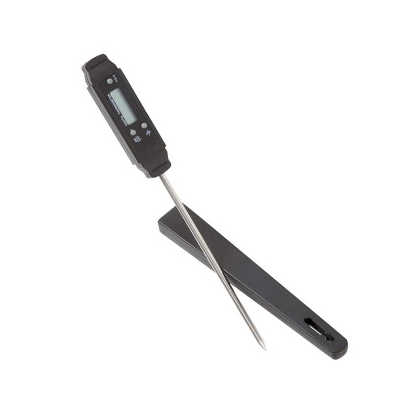 Tradisjonelt digitalt steketermometer som viser aktuell temperatur i maten. Brukervennlig.